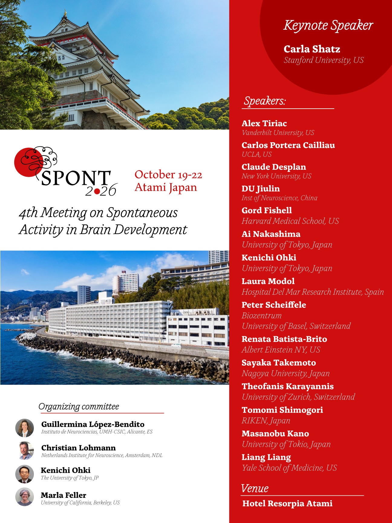 We invite you to participate in the “Spontaneous Activity in Brain Development” meeting, a dynamic forum for neuroscientists exploring brain activity during development. The fourth SPONT meeting, SPONT2026, is scheduled from 19-22 October 2026 in Atami, a picturesque seaside town near Tokyo, Japan.